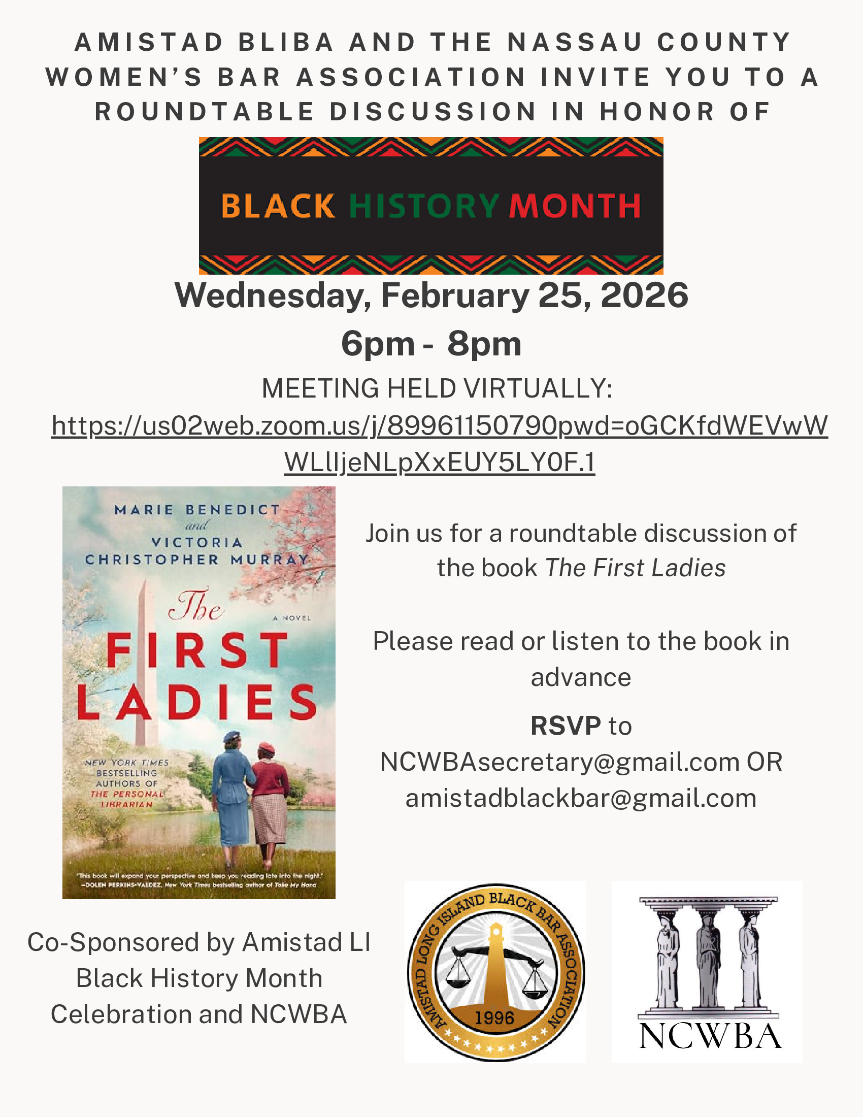 Join Amistad Long Island Black Bar Association and the Nassau County Women’s Bar Association for a special Black History Month Roundtable Discussion honoring The First Ladies by Marie Benedict and Victoria Christopher Murray.