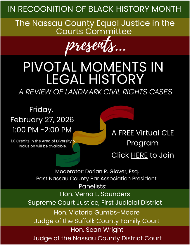 In recognition of Black History Month, the Nassau County Equal Justice in the Courts Committee presents a timely and thought-provoking review of landmark civil rights cases that have shaped our legal system and advanced equal justice.