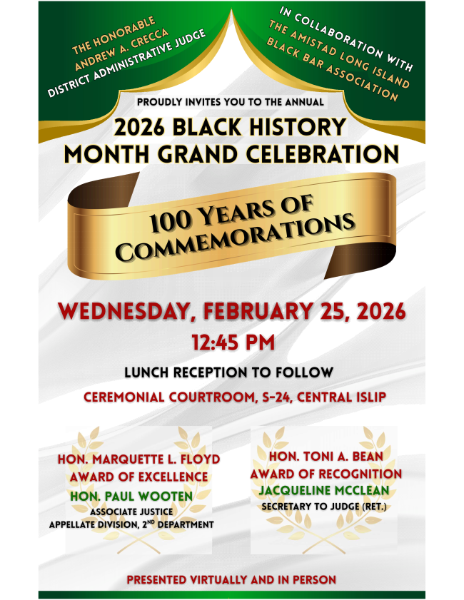 Join The Honorable Andrew A. Crecca, District Administrative Judge, in collaboration with the Amistad Long Island Black Bar Association, for the 2026 Black History Month Grand Celebration honoring a century of reflection, progress, and achievement.